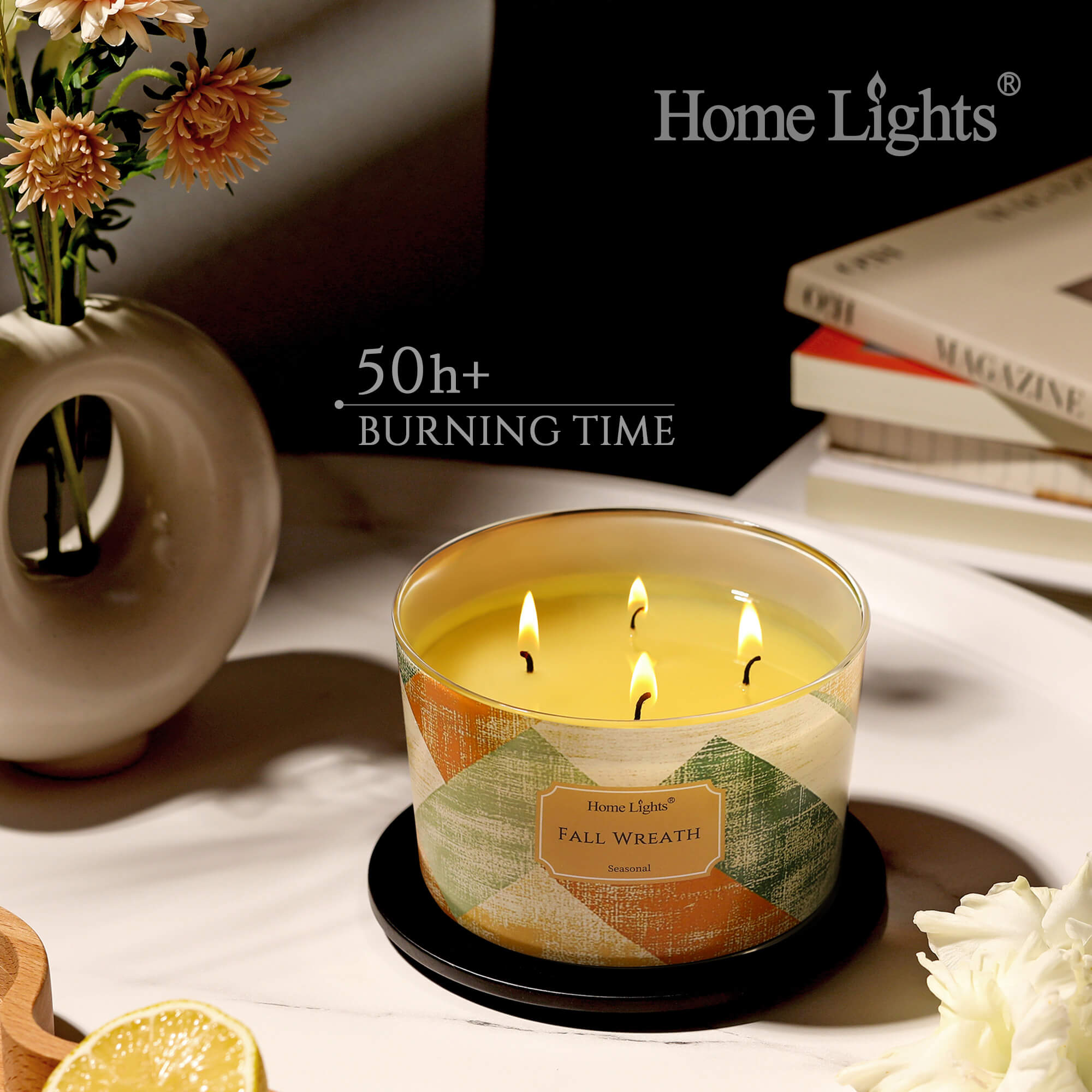 HomeLights Soy Wax Candles for Home Scented, 4-Wick Candles in Fall Wreath Scented, Rustic Modern Aromatherapy Candles Gift for Parties, Relaxing, 18oz