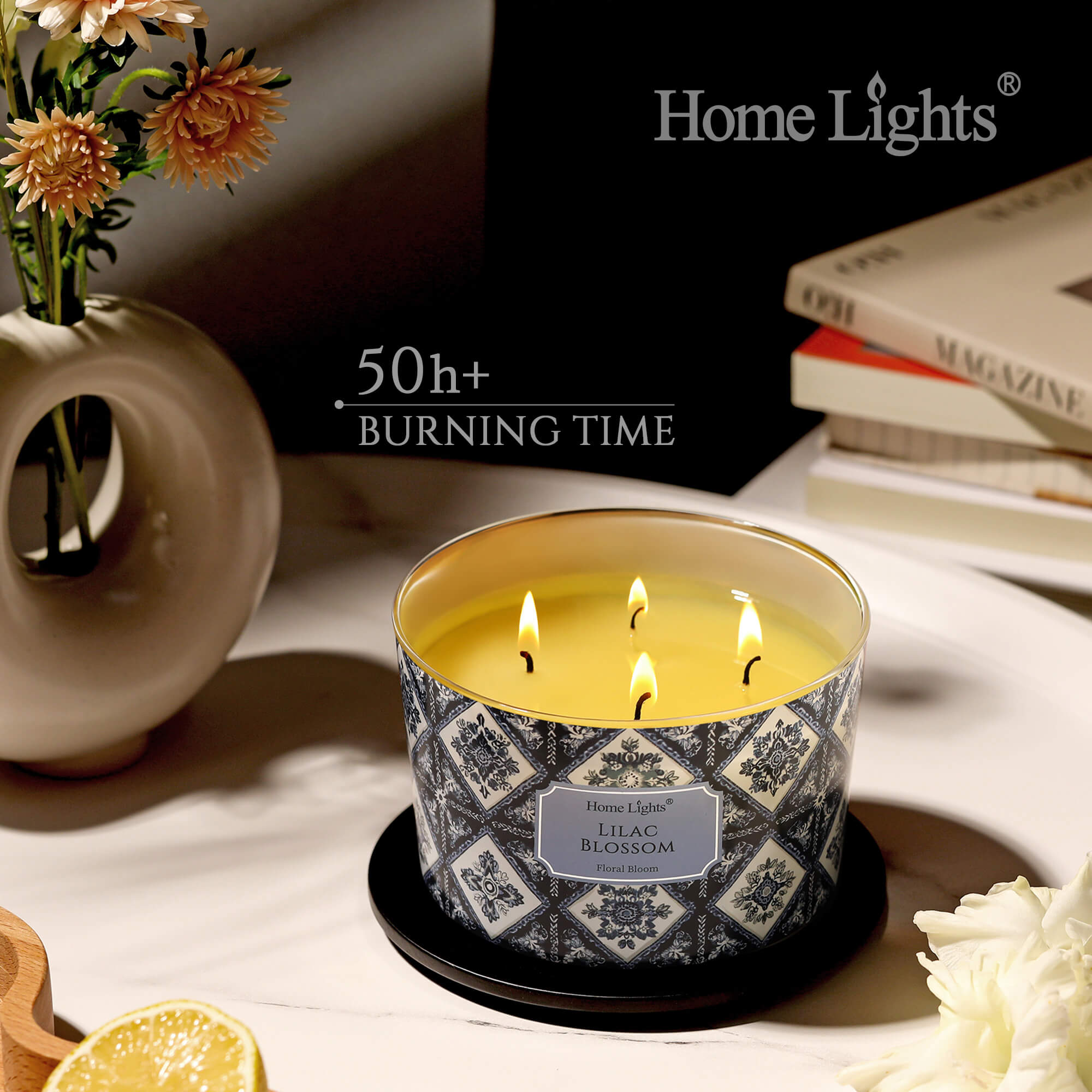 HomeLights 4-Wick Candles for Home Scented - 18oz Soy Wax Blend Candle Long-Lasting Fragrance, Bohemian Natural Textures Home Decor and Housewarming Gifts, Lilac Blossom