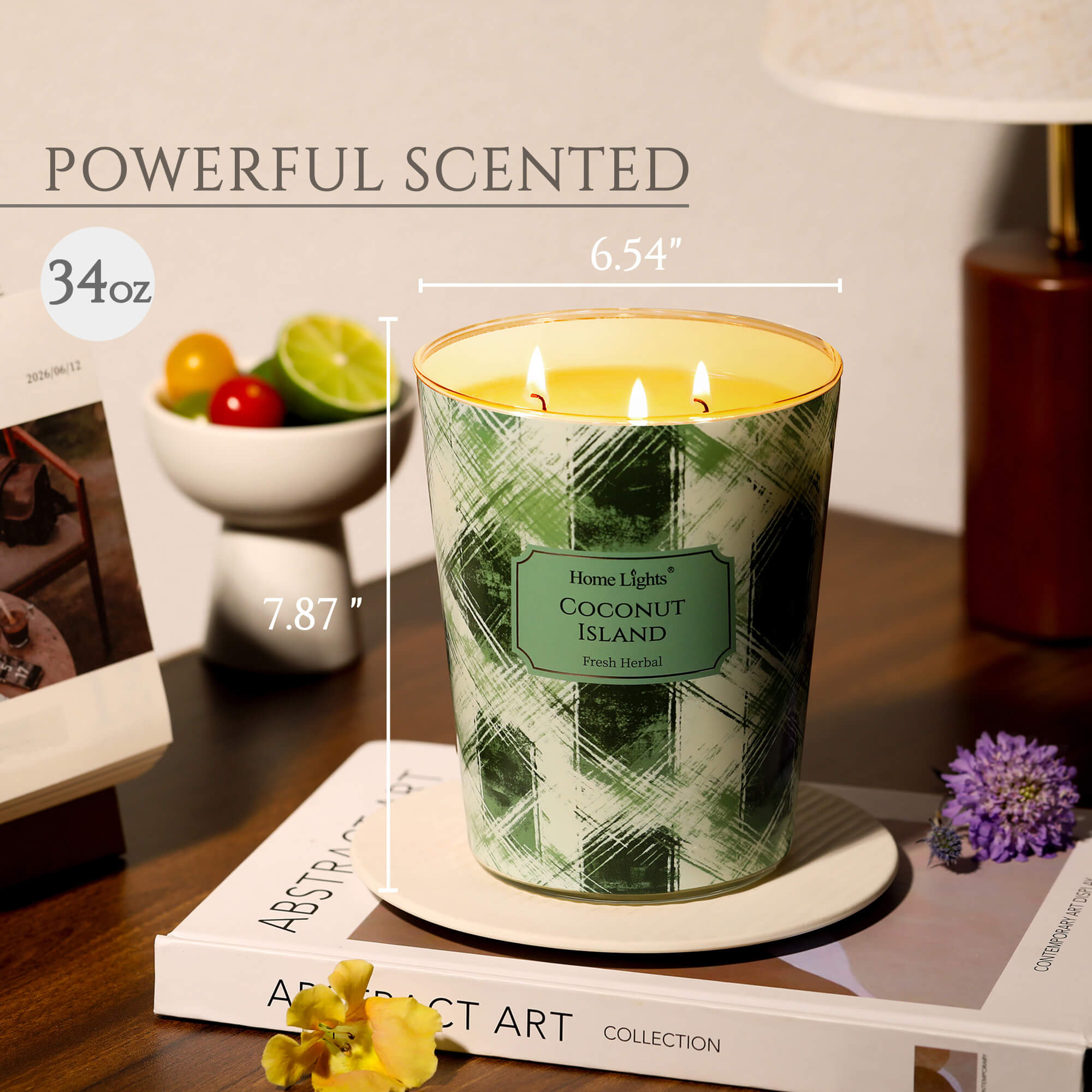 HomeLights 3-Wick Candles for Home Scented - 34oz Soy Wax Blend Candle Long-Lasting Fragrance, Scandinavian Minimalist Design Home Decor and Housewarming Gifts, Coconut Island
