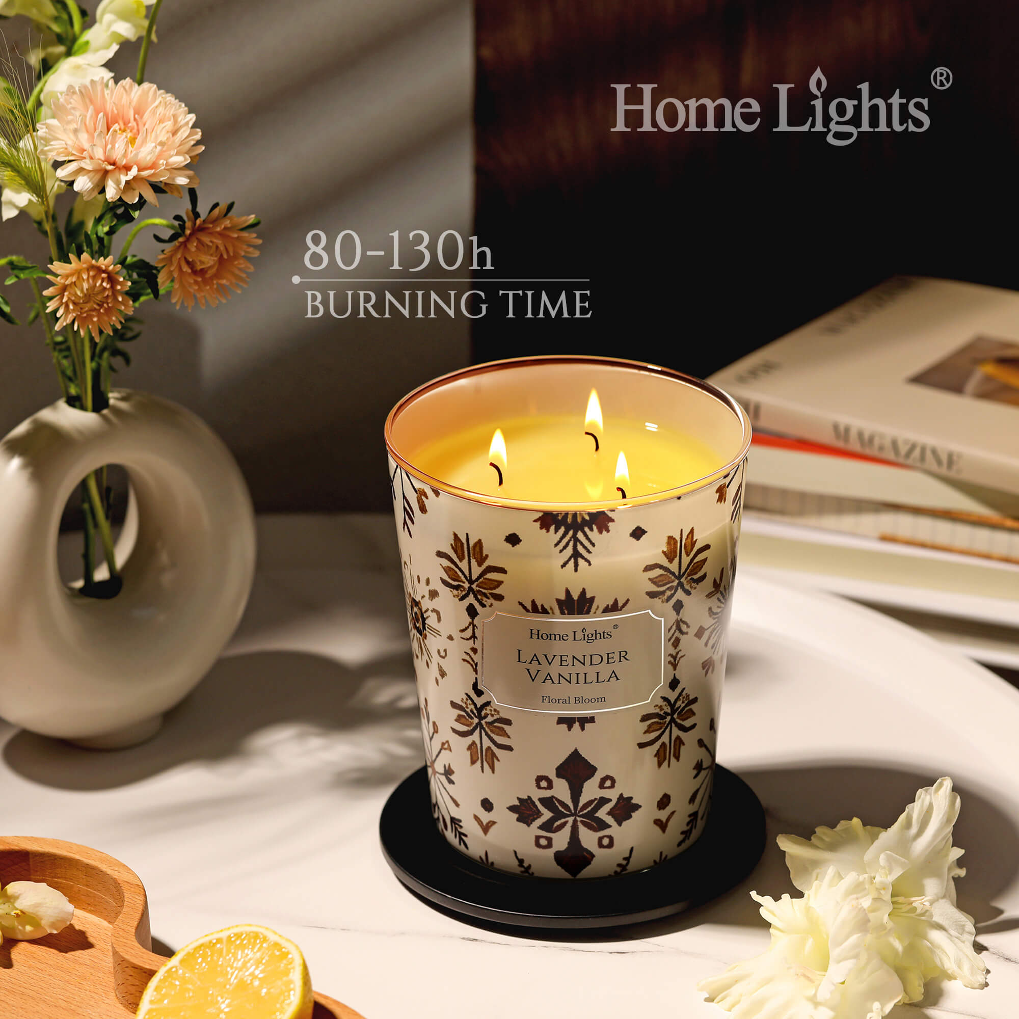 I love both lavender and vanilla individually, but I've been burned before by candles that are either too floral or too sweet. This one is perfectly balanced. The lavender is fresh and calming, and the vanilla is warm and subtle—they work together beautifully without competing. It's sophisticated and cozy at the same time. I keep it in my living room and it makes the whole space feel so inviting. The 3-wick burns evenly and the soy wax is top quality